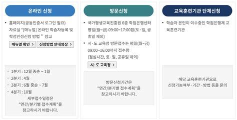- 신청 및 접수 일정은 매 분기 국가평생교육진흥원 홈페이지 공지사항에서 확인해야 하며,