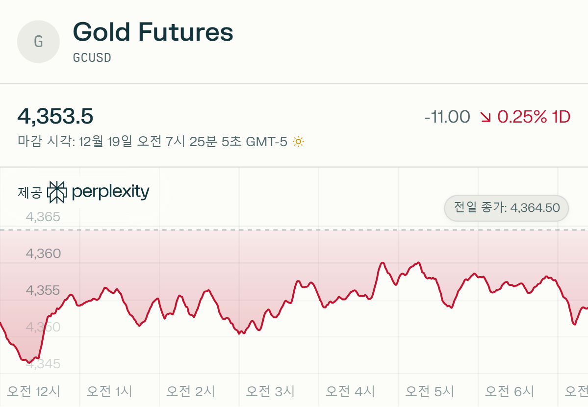 금 선물(Gold Futures, GCUSD) 가격은 4,353.2 USD로, 전일 대비 -11.3 USD(-0.26%) 하락했습니다.