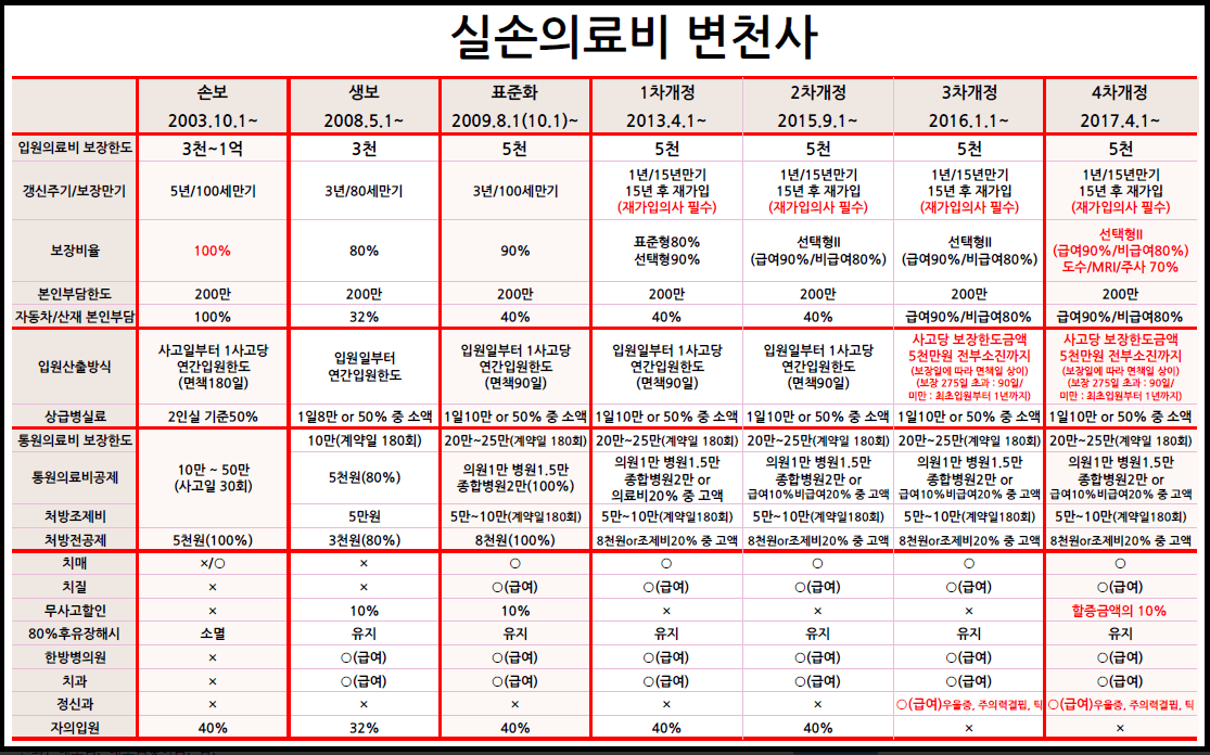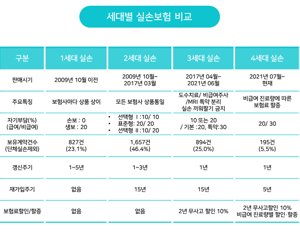 - 4세대 실손보험의 경우 보장 내용이 표준화되어 있지만, 보험사별로 보험료, 자기부담금, 특약 등